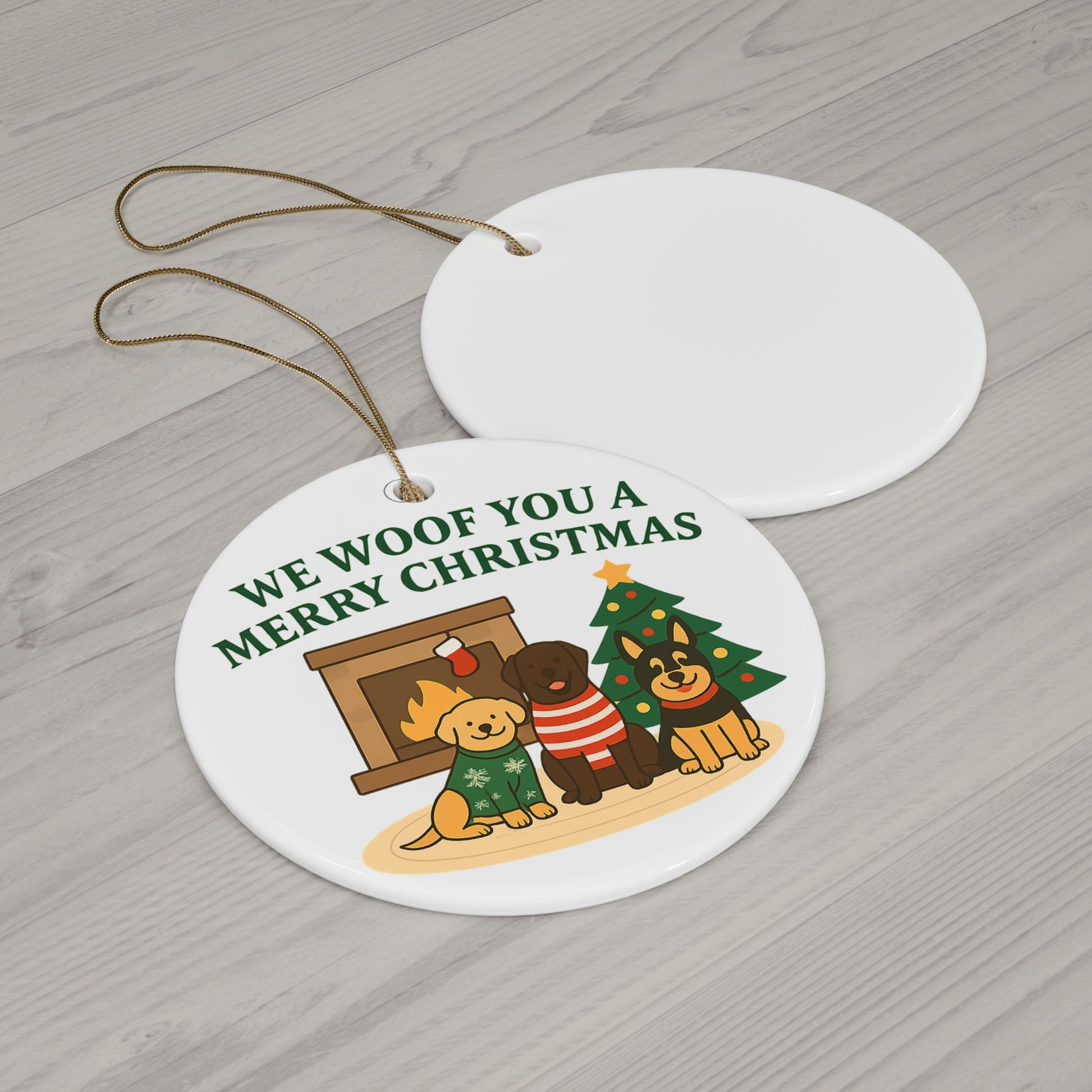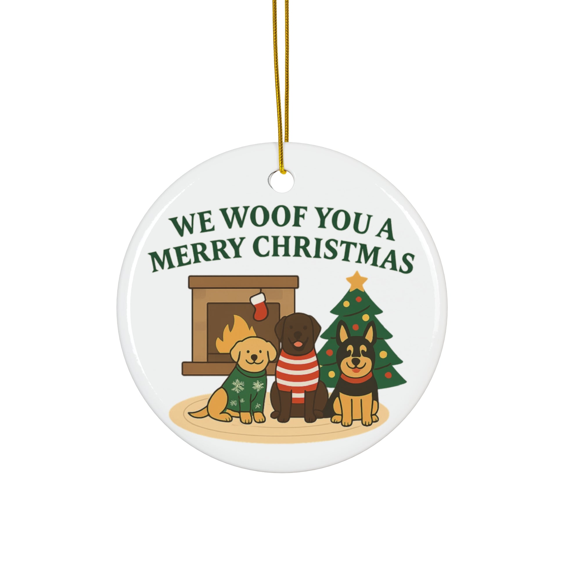 We Woof You a Merry Christmas Ornament – Personalized Dogs by Fireplace & Tree